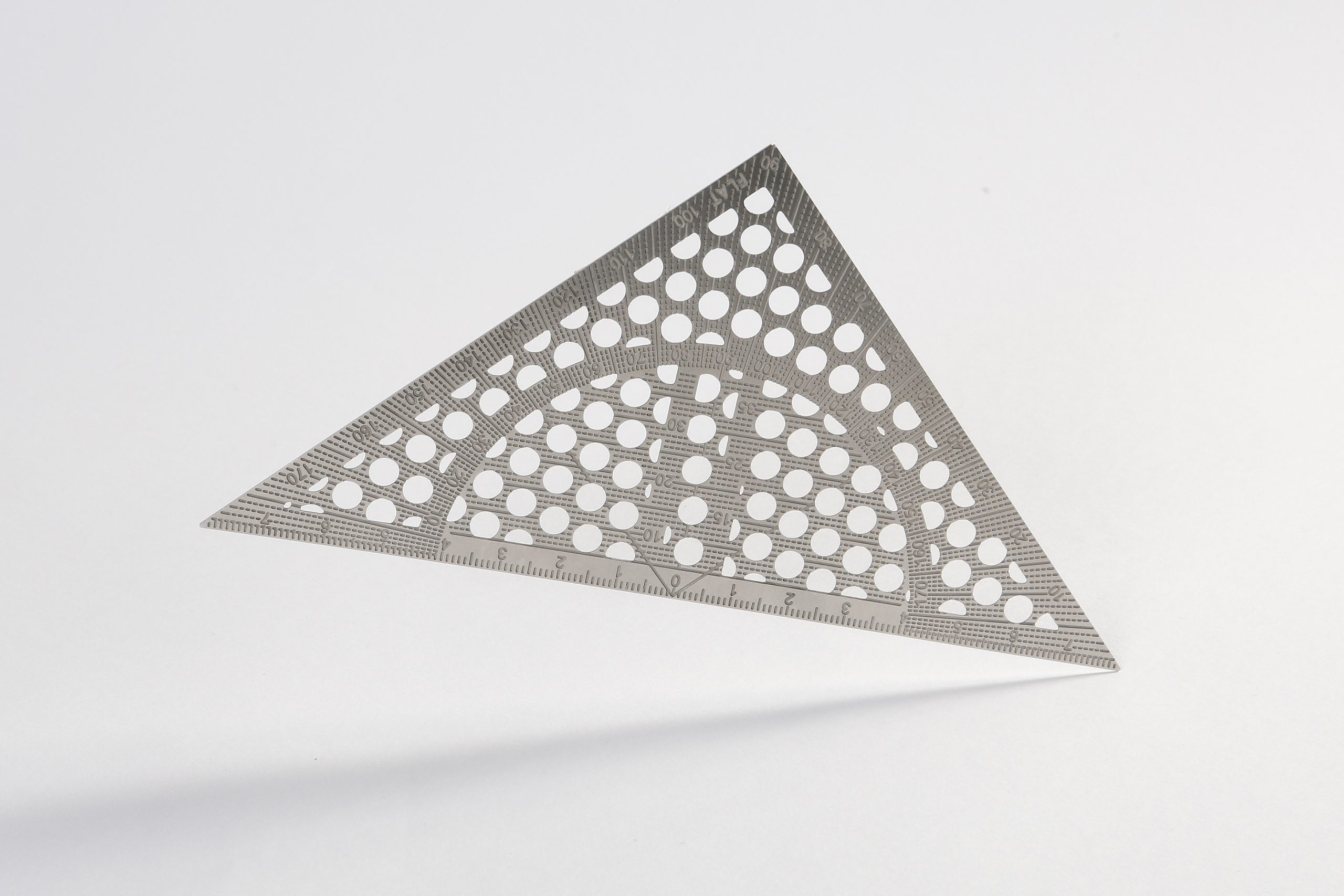 This triangle ruler is an answer to the constantly breaking corners of plastic set squares which most of us might remember from schooldays. Even when used with a cutter the edges won’t be damaged. The perforation of the sheet metal provides the transparency that is needed when drawing or cutting angles or parallel lines. The set square is made out of stainless steel with precisely etched lines and numbers.